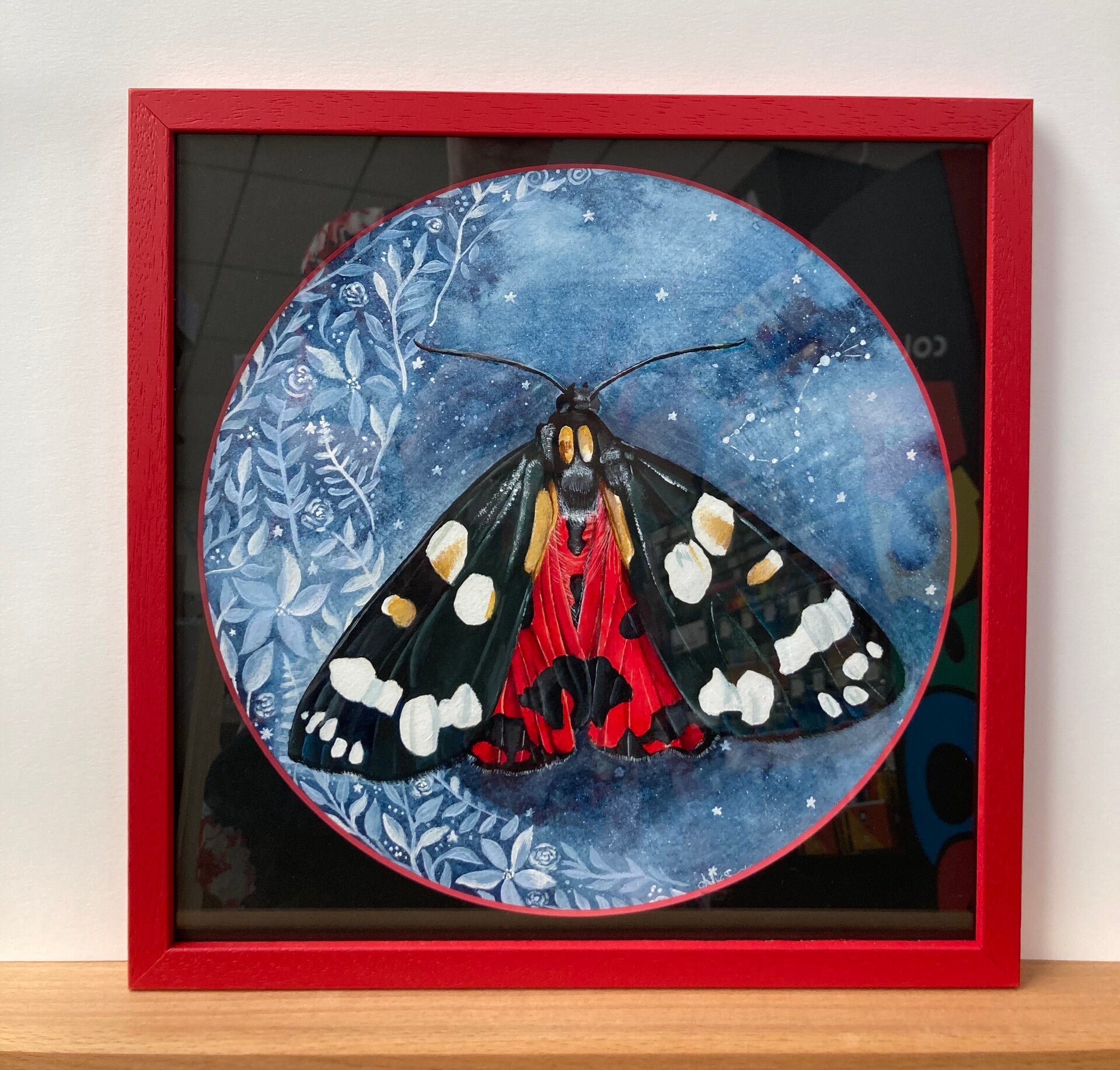 Red tiger Moth and the floral moon. Aquarelverf en acrylverf. Ingelijst met passe-partout. Formaat 30x30